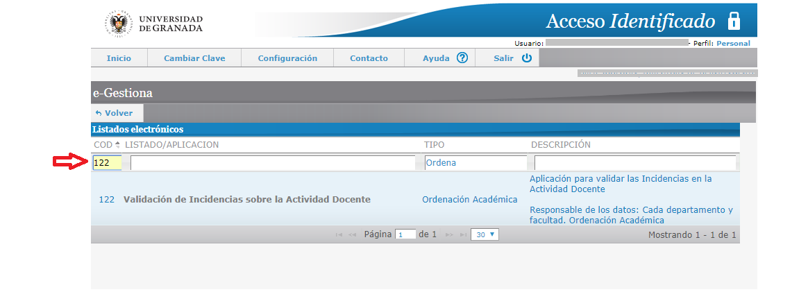 Además de la posibilidad existente a través del perfil de la red de administración de la UGR, dichos responsables disponen, en su perfil personal del sistema de Acceso Identificado UGR , a través de la opción “eGestiona”, de la posibilidad de realizar esta labor directamente. Una vez dentro de “eGestiona”, deberá dirigirse a la opción “Ordenación Académica” de “eGestiona” y, posteriormente, a la aplicación “122 Validación de Incidencias sobre la Actividad Docente”. Dentro de “Ordenación Académica”, puede introducir directamente el número 122 en el campo “COD” para localizar fácilmente esta nueva funcionalidad.